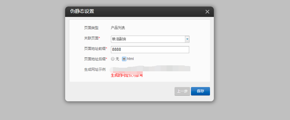 1.以PC端文章详情为例,首先在编辑器中点击“设置”-“伪静态设置”,点击“添加伪静态规则”,选择页面类型“文章详情”或者“产品详情”,选择关联页面并填写页面地址前缀,都为必填项,页面地址后缀可二选一,填写完成后点击保存即可,如图所示: